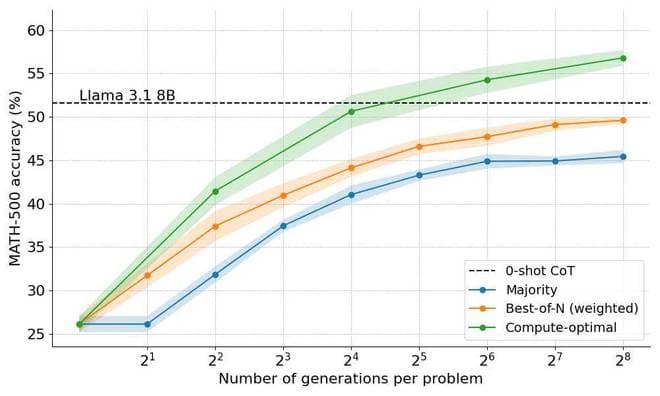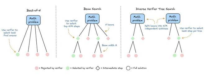 虽然总体上很明显,集束搜索是一种比 Best-of-N 或多数投票更好的搜索策略,但 DeepMind 的论文表明,每种策略都有权衡,这取决于问题的难度和测试时计算预算。