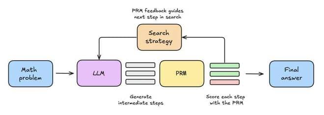 作为一种结构化搜索方法,集束搜索可以系统地探索解决方案空间,使其成为在测试时改进模型输出的强大工具。与 PRM 结合使用时,集束搜索可以优化问题解决中中间步骤的生成和评估。集束搜索的工作方式如下: