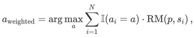 加权 Best-of-N:汇总所有相同响应的得分,并选择总奖励最高的回答。这种方法通过重复出现来提高分数,从而优先考虑高质量的回答。从数学上讲,回答的权重 a_i: