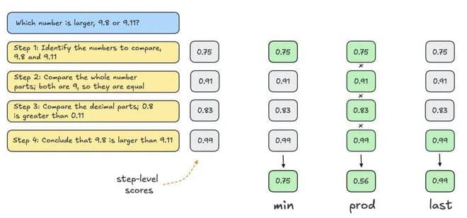 Min:使用所有步骤中的最低分数。Prod:使用阶梯分数的乘积。Last:使用步骤中的最终分数。该分数包含所有先前步骤的累积信息,因此将 PRM 有效地视为能够对部分解决方案进行评分的 ORM。