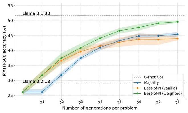 然而,尽管有这些改进,仍然达不到 Llama 8B 模型所达到的性能,并且在 N=256 时 Best-of-N 方法开始趋于稳定。