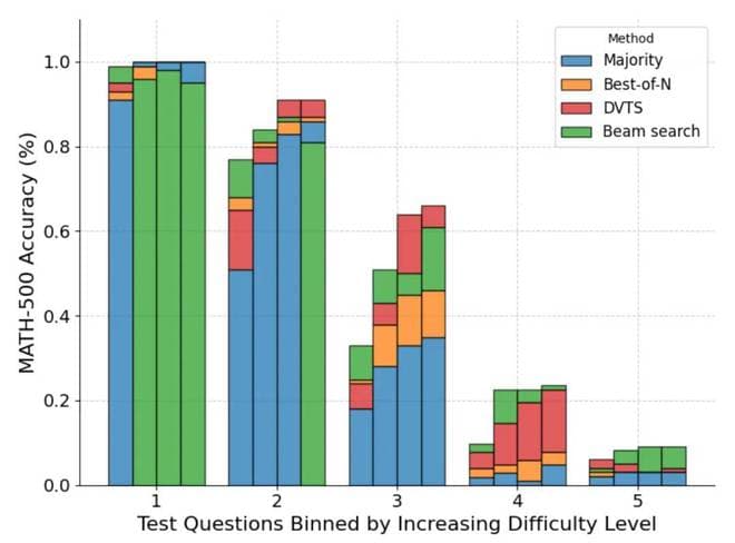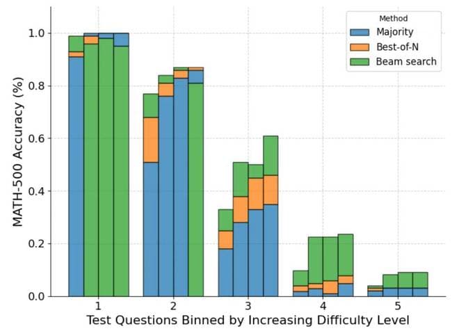 可以看到,每个条形表示测试时计算预算,并且在每个条形内显示每种方法的相对准确度。例如在难度等级 2 的四个条形中: