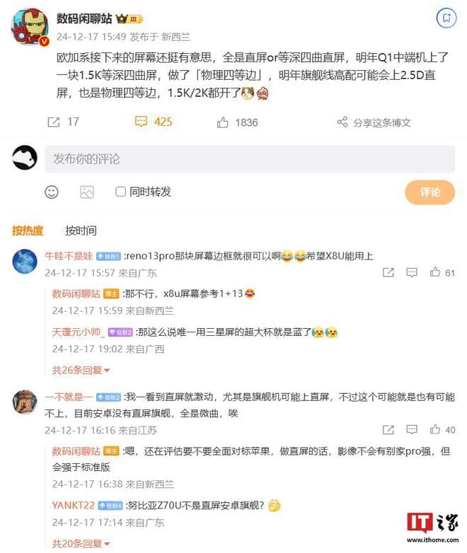 评论区中有网友询问 OPPO Find X8 Ultra 手机的屏幕形态,博主称“X8 U 屏幕参考 1+13”;另外有网友询问旗舰机是否有可能上纯直屏,博主回复“还在评估要不要全面对标苹果,做直屏的话,影像不会有别家 Pro 强,但会强于标准版”。