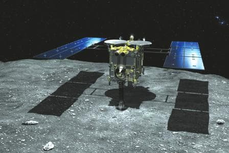 日本“隼鸟2”号探测器降落在小行星“龙宫”模拟图。