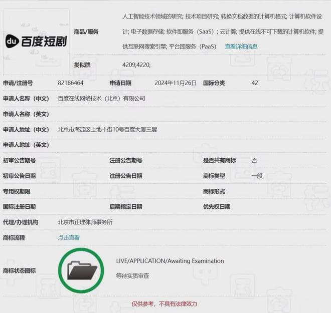 【百度回应进军短剧领域:是当前内容生态的一个重点发展方向】天眼查知识产权信息显示,百度在线网络技术(北京)有限公司申请注册“百度短剧”商标,国际分类为网站服务、科学仪器、教育娱乐,当前商标状态均为等待实质审查。对此,百度相关负责人表示,短剧是当前内容生态的一个重点发展方向,目前百度短剧平台已汇聚2.4 万+部短剧。2025年,将从分发、分账、奖励、独播以及招商五大方面进行全新升级。(21财经)