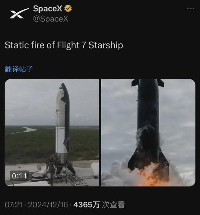 【SpaceX第二代星舰发射进入倒计时,S33完成静态点火】SpaceX昨日(12月16日)在X 平台发布推文,宣布第二代星舰的第一艘飞船(编号S33)于北京时间12月16日4点14分完成静态点火测试,持续约10秒,为即将到来的第七次轨道试飞做准备。(新浪财经)