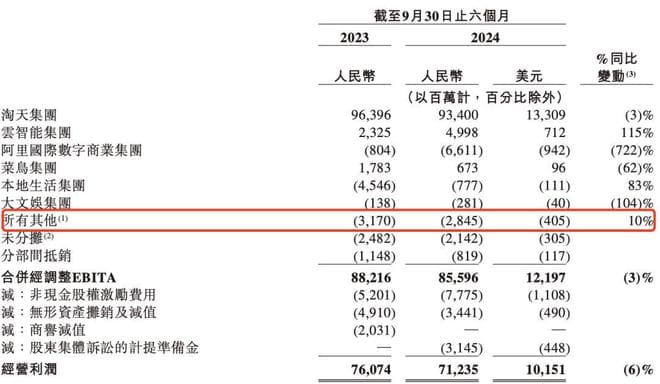 最新财报显示,截至2024年9月30日的六个月内,包括银泰、盒马、高鑫零售等在内的“所有其他”业务,经调整EBITA亏损为28.45亿元,持续的亏损加重了集团的盈利负担。