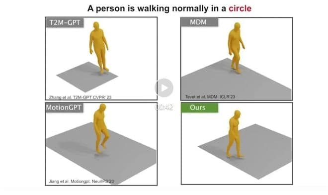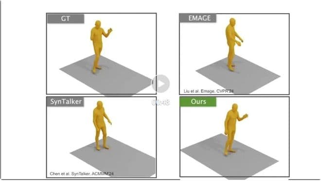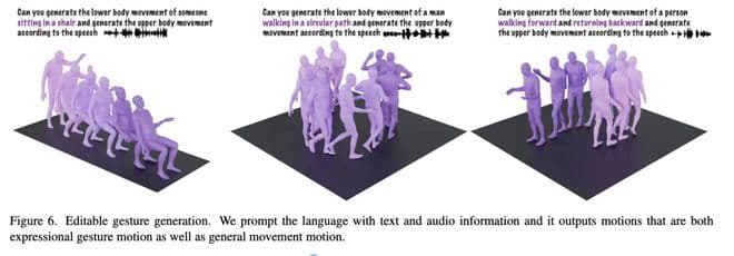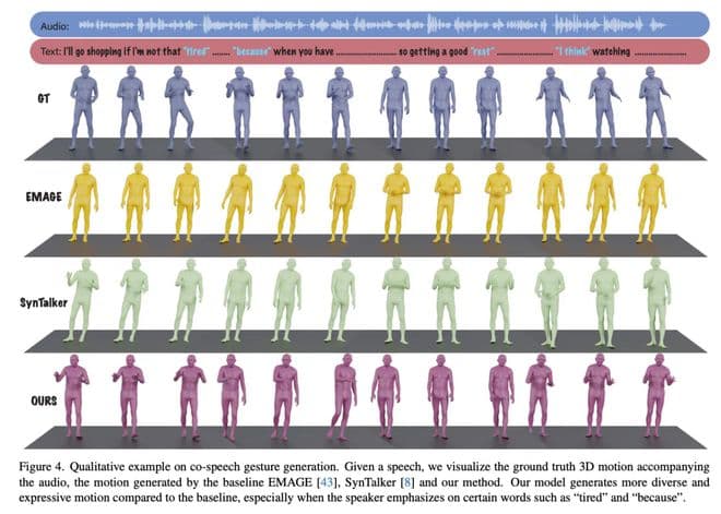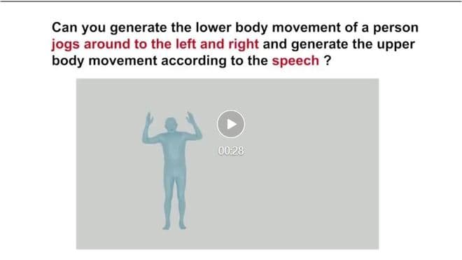 这个模型可以同时接受音频和文本输入来生成动作。比如你指定这个人下半身的动作是绕圈走,并根据语音生成上半身动作,它就会配合你生成对应的动作。