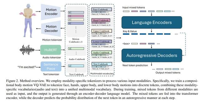 作者使用针对特定模态的 tokenizer 来处理各种输入模态。具体来说,他们训练了一个组合式的身体动作 VQ-VAE,将面部、手部、上半身和下半身的动作 token 化为离散的 token,并将这些针对特定模态的词汇表(音频和文本)合并成一个统一的多模态词汇表。