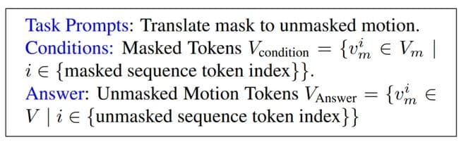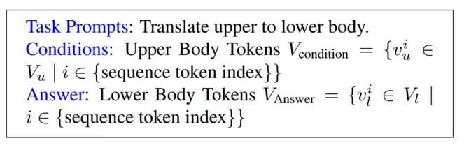 为了建模这些不同身体部位之间的相关性,作者训练模型接收随机选择的身体部位组合(例如,上半身或上半身 + 面部)并预测另一个随机选择的其他身体部位组合(例如,下半身或下半身 + 手部)。这有助于模型学习身体部位之间的空间关系。下面是一个定义任务提示、条件和答案的示例模板。模型接收提示和条件作为输入,并按预期输出答案。