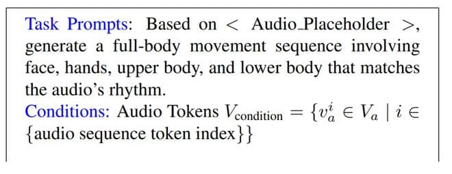 预训练之后,模型获得了对动作模态词汇中潜在的语法和句法的理解,以及音频和文本模态之间的良好对齐。然后他们使用成对数据在下游任务上对模型进行微调,例如伴语手势(co-speech gesture)生成或文本到动作生成。为了使模型在遵循自然人类指令的同时执行所需的下游任务,作者构建了一个多任务指令跟随模板,将几个关键任务(如音频到动作、文本到动作和情感到动作)格式化为指令。