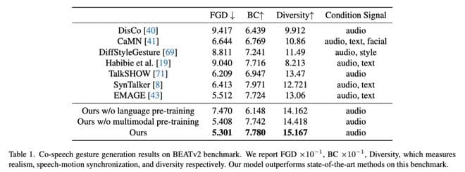 该团队在 BEATv2 数据集上评估模型的音频到动作生成能力。他们使用了 BEATv2 和 Librispeech 两个数据集(总共包含 1000 小时音频 - 文本数据和 60 小时动作数据)来训练模型(在预训练中,他们确保模型不会看到任何音频到动作的数据),并在特定说话者的数据上进行测试。他们通过三个指标来评估模型效果:手势的真实性(FGD)、与语音的同步性(BC)以及动作的多样性(Diversity),以全面衡量模型的表现。