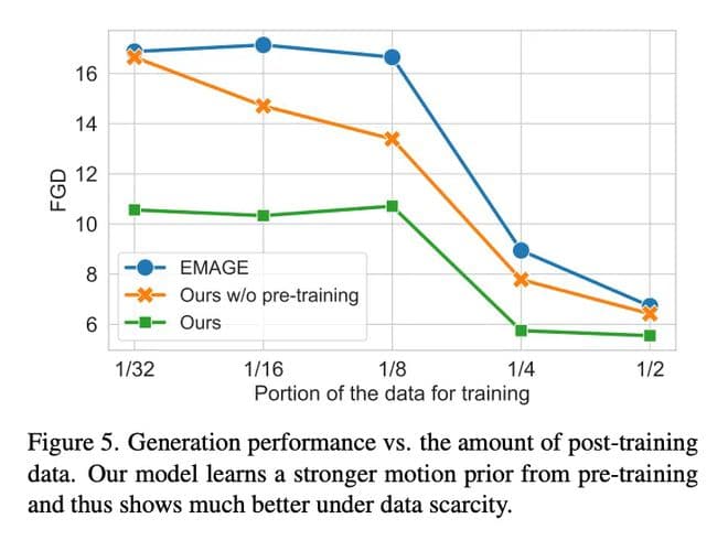 实验结果如图 5 所示。仅使用 1/32 的配对训练数据,该团队的完整模型相比无预训练模型,FGD 分数更低。随着配对微调数据量增加,性能差距虽有所减小,但完整模型始终优于无预训练模型和 EMAGE 基线。这证明了预训练的价值以及模型在极度缺乏数据时的出色泛化能力。