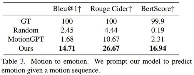 在这项任务上,MotionGPT 完全失败,其表现与随机乱猜差不多,因为它的训练目标就只是描述一般动作,而不是细微的手势动作和肢体语言。新模型的表现远远优于随机和 MotionGPT,这表明其能够根据动作预测情绪。以下动图展示了一个示例。