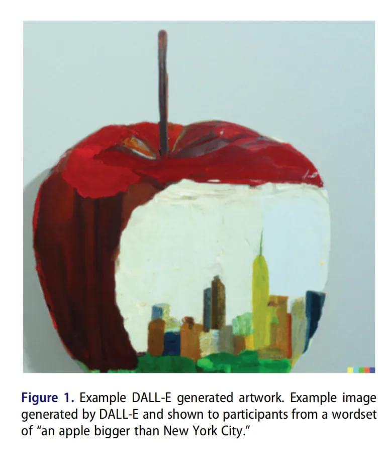 实验的核心是让参与者创作三组文字提示,然后看看生成的图像创意如何。为了让参与者理解任务,研究人员给出了一个示例提示"一个比纽约市还大的苹果",并展示了AI据此创作的图像。
