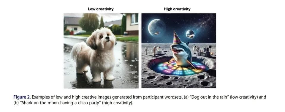 首先,研究发现所有创意相关指标之间都存在普遍的正相关关系。AI生成图像的创意评分与参与者提供的文字提示的语义多样性呈现正相关(相关系数r=0.16),这意味着当参与者能够想出概念跨度更大的词组组合时,最终的艺术作品往往会被评为更有创意。比如,将"鲨鱼"和"月球迪斯科派对"这样风马牛不相及的概念组合在一起,比简单描述"雨中的狗"更可能产生富有创意的作品。