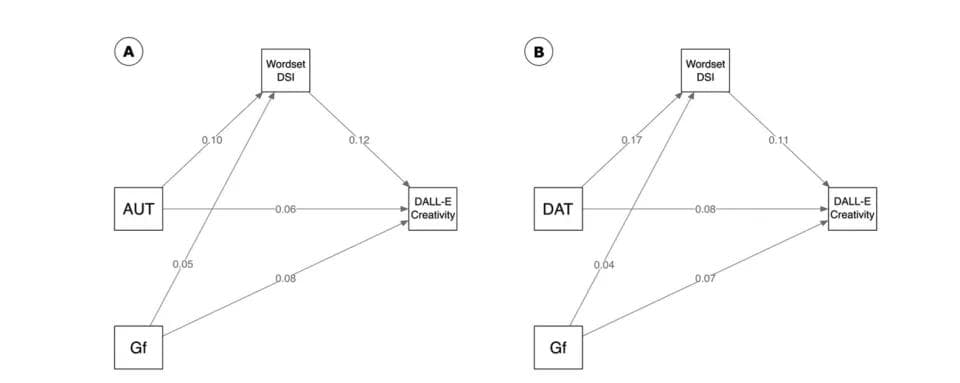 研究还发现,参与者在标准创意测试中的表现与其AI艺术作品的创意评分也呈现正相关。具体来说,替代用途任务(AUT)的原创性得分与AI艺术创意评分的相关系数为0.11,而发散联想任务(DAT)的得分与AI艺术创意评分的相关系数为0.14。这表明,那些在传统创意测试中表现出色的人,确实倾向于产生更具创意的AI艺术作品。