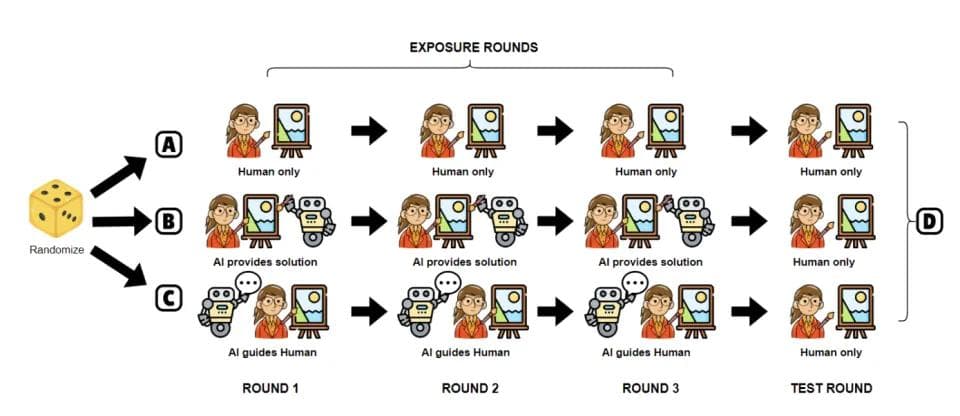 参与者被分成三组。第一组完全靠自己思考;第二组可以看到AI直接给出的答案;第三组则直接让AI当老师,指导他们做创作。但在实验的最后阶段,所有人都需要独立完成任务,不能再借助AI的帮助。