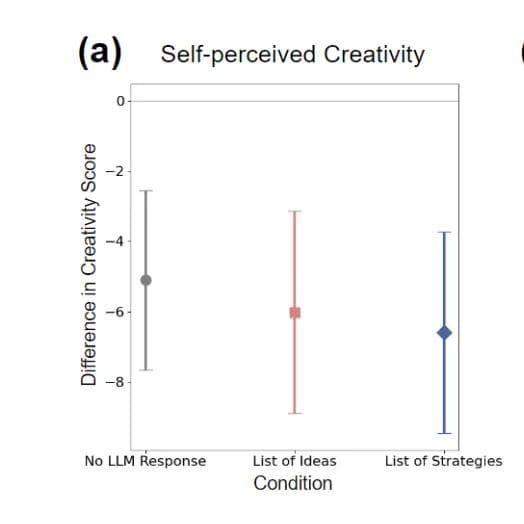 比如这项研究还揭示了一个更值得去关注的现象:在使用AI的过程中,参与者的自信心普遍下降。他们对自己的创造能力的评估变得更低了。这种自信心的下降可能会影响人们未来面对创造性任务的态度和表现。