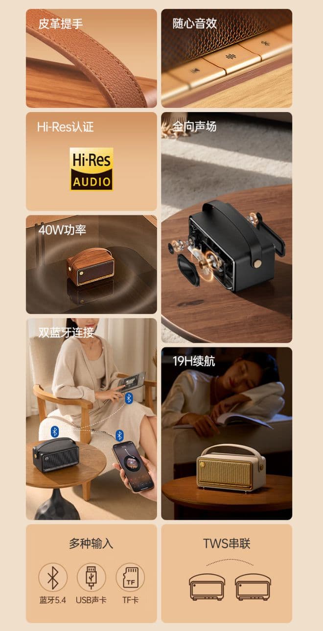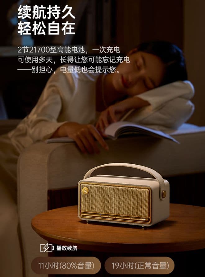 该款音箱功率为 40W ,通过 Hi-Res 金标认证,支持 96kHz / 24Bit 音频解析。音箱采用 2 节 21700 型电池供电,宣称 80% 音量可播放 11 小时、正常音量可播放 19 小时。