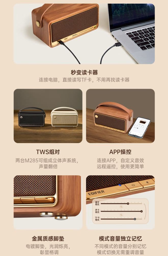 据介绍,漫步者 M285 便携音箱拥有棕木纹、贝母白、珍珠黑 3 种配色,配备双高音及中低音 + 被动盆组成的双面发声系统,支持 360° 声场播放。