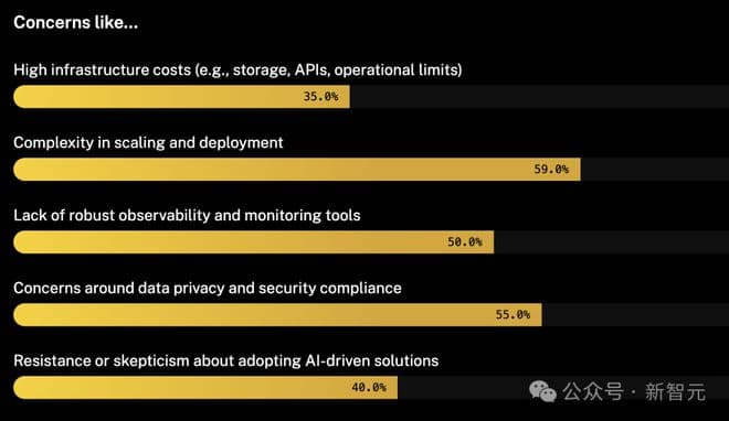 在模型的扩展和部署中,数据隐私和安全合规性成为主要关注点, 「缺乏监控工具」和「高基础设施成本」这两项因素也阻碍了技术的落地应用。