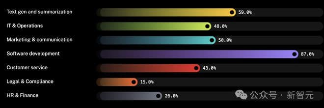 LLM在软件开发中得到广泛应用,尤其在市场营销、IT运营和文本摘要等方面,客服、人力资源和法律领域的使用兴趣也在日益增长。