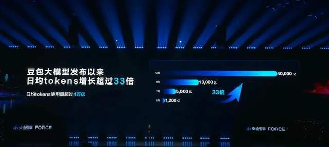 火山引擎总裁谭待介绍,今年 12 月,豆包系列模型的日均 tokens 使用量超过 40000 亿,是 5 月的 33 倍。