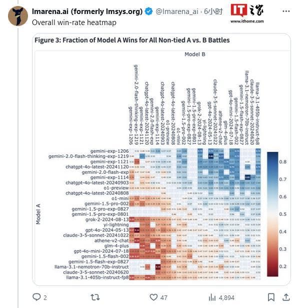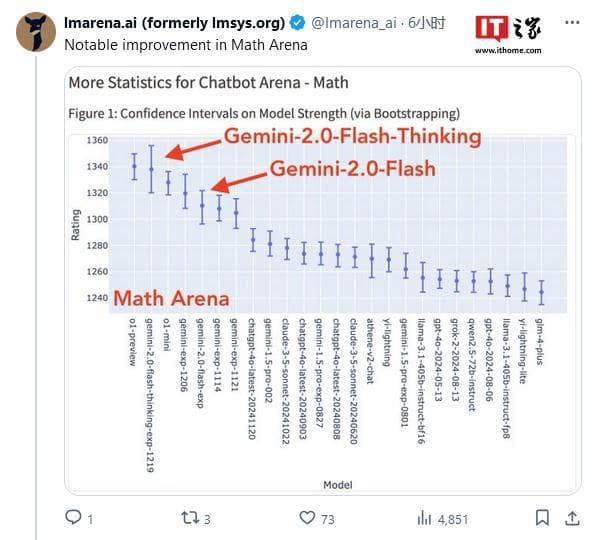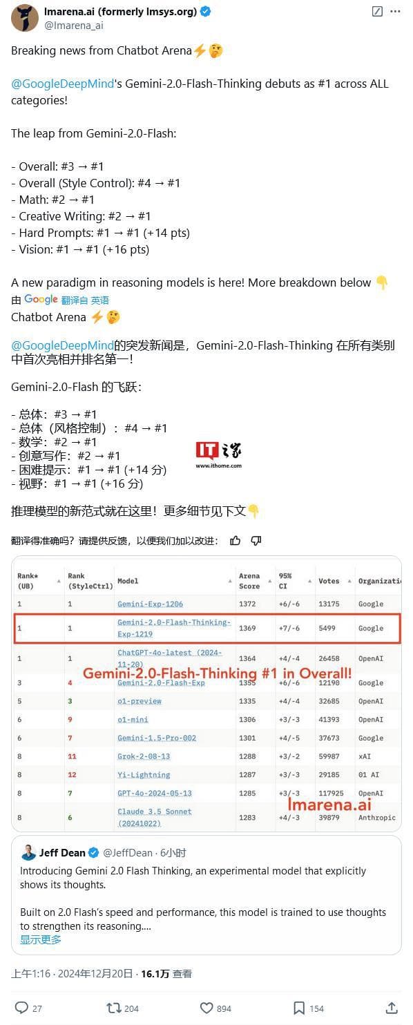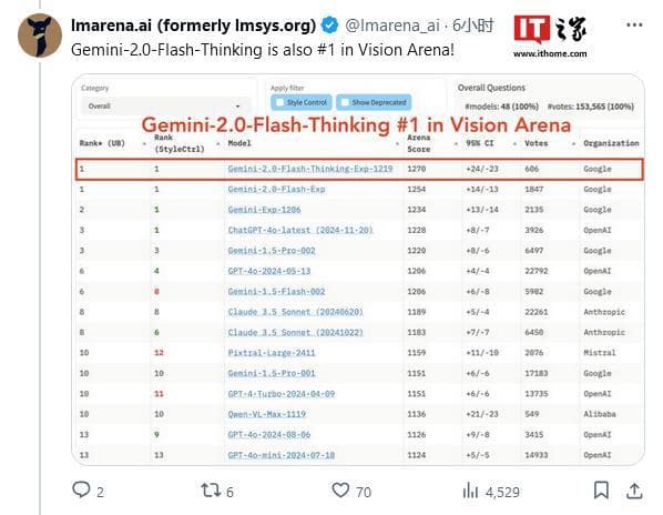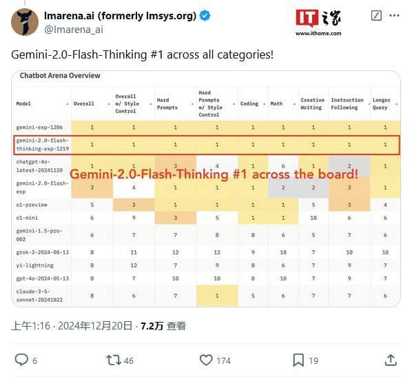 该模型基于 Gemini 2.0 Flash 的速度和性能构建,在 Chatbot Arena LLM 排行榜上,Gemini 2.0 Flash Thinking 模型在所有类别中均排名第一,较之前的 Gemini-2.0-Flash 模型有显著提升,尤其在“硬提示”和“视觉”两项分别提升了 14 分和 16 分。