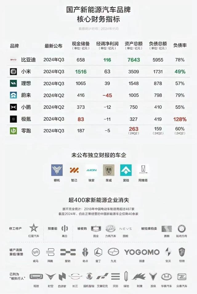 根据数据统计,极越汽车2024年Q3的经调整净利润为亏损11亿元,资金链断裂迹象早已显现。虽然极越曾以“高性能电动车”抢占市场,推出多款性能优越的车型,但始终未能扭转亏损局面,用户口碑和市场反馈也未达到预期。与之形成对比的是比亚迪、理想和小米等头部车企,它们不仅在现金储备方面遥遥领先(如比亚迪658亿元、小米1516亿元),在盈利能力和负债控制上也表现优异。极越的破产警示,凸显了新能源车企间竞争的残酷性。