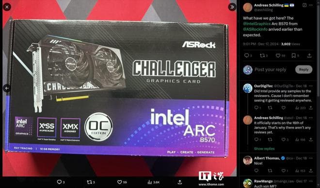 另据德媒 Hardwareluxx 编辑 Andreas Schilling 在 12 月 17 日的 X 平台动态,这位编辑也提前收到了来自华擎的锐炫 B570 Challenger 10GB OC 测试样卡。
