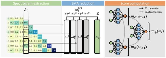 图|NAMM 执行过程中三个主要步骤的示意图:将注意力序列处理为频谱图(左图),用 EMA 压缩信息(中图),计算分数以决定记住什么(右图)。