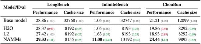 他们在 Llama 3 8b 基本模型的基础上训练 NAMM,并在 LongBench、InfiniteBench 和 ChouBun 上全面评估了这种强大的内存增强 LM:这三个基准测试评估了 LM 处理超长输入文本信息的能力,以回答自然语言和编码问题,总计 36 个不同的任务。他们将 NAMM 与 H₂O 和 L₂(两种之前手工设计的内存管理方法)进行了比较。