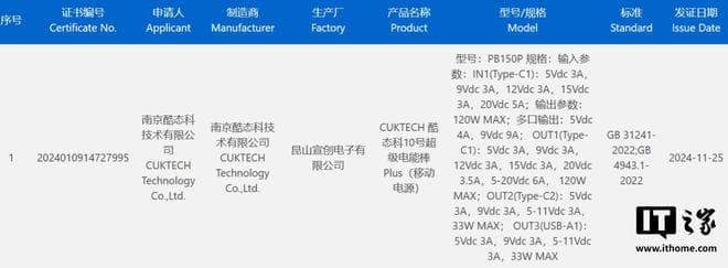 IT之家注意到,酷态科 10 号超级电能棒 Plus 移动电源于 11 月 25 日通过 3C 认证,型号为 PB150P。简单来说,该产品支持单口最高 100W 输入功率以及 120W 输出功率,其中 C1 口为120W,C2 口 33W,A 口 33W 输出功率。