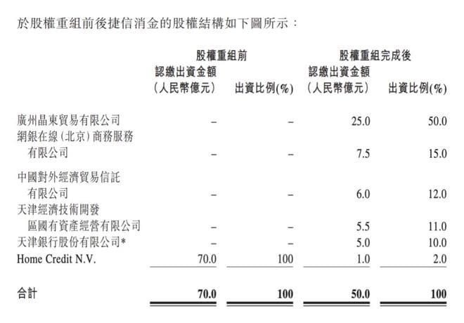 股权重组后,捷信消金股东及其持股比例分别为广州晶东贸易有限公司(下称"广州晶东贸易",持股50%)、网银在线(北京)商务服务有限公司(下称"网银在线",持股15%)、中国对外经济贸易信托有限公司(持股12%)、天津经济技术开发区国有资产经营有限公司(持股11%)、天津银行(持股10%)、Home Credit N.V.(持股2%)。