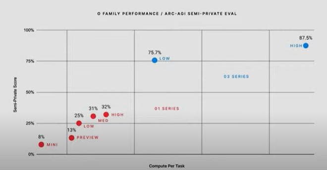 Chollet解释说,在低计算模式下、即计算中每个任务 20 美元的半私人评估中,o3的得分为 75.7%,在高计算模式下、即每个任务数千美元的评估中,o3的得分为 87.5%。它不仅仅是蛮力,它是新领域的功能,需要科学领域认真关注。