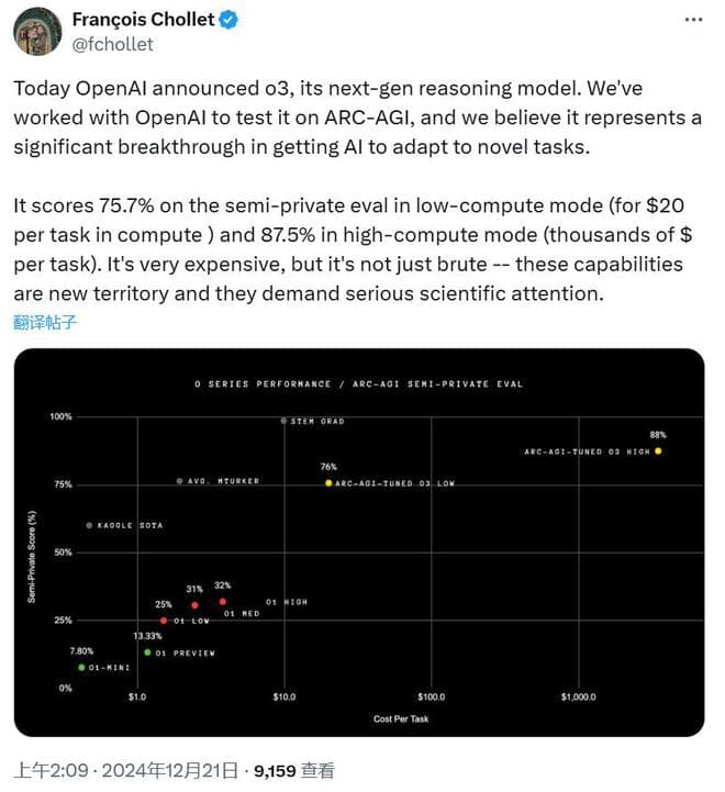 Chollet周五在社交媒体X发帖,公布了同OpenAI合作进行的ARC-AGI结果,称“我们相信这代表了让AI适应新任务的重大突破。”