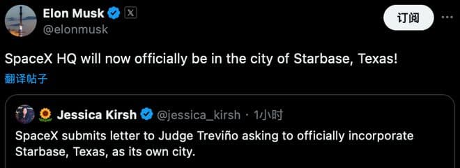 早在 21 年,他就和这位接收请愿书的美国宪法官相谈甚欢了,完事了还在社交媒体上来了句: “Creating the city of Starbase , Texas.”