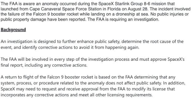 第二次是 8 月 28 日的星链翻车事故,为此 FAA 还郑重其事地发布了一份书面声明。