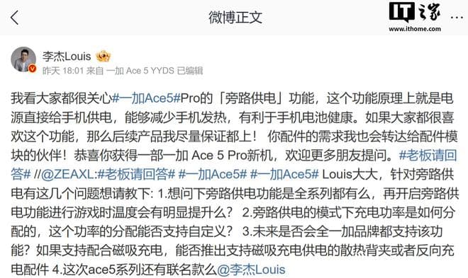 IT之家 12 月 22 日消息,一加中国区总裁李杰昨日(12 月 21 日)就一加 Ace 5系列手机,在线上对用户的问题进行集中解答。