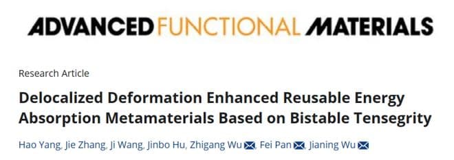 1.Hao Yang, Jie Zhang, Ji Wang, Jinbo Hu, Zhigang Wu, Fei Pan, Jianing Wu .Delocalized Deformation Enhanced Reusable Energy Absorption Metamaterials Based on Bistable Tensegrity. Advanced Functional Materials(2024). https://doi.org/10.1002/adfm.202410217
