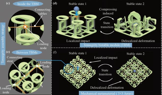 张拉整体结构的特点在于,其能够实现去局部变形机制。通过采用一种创新的“连接策略”,整个超材料均能实现去局部变形。