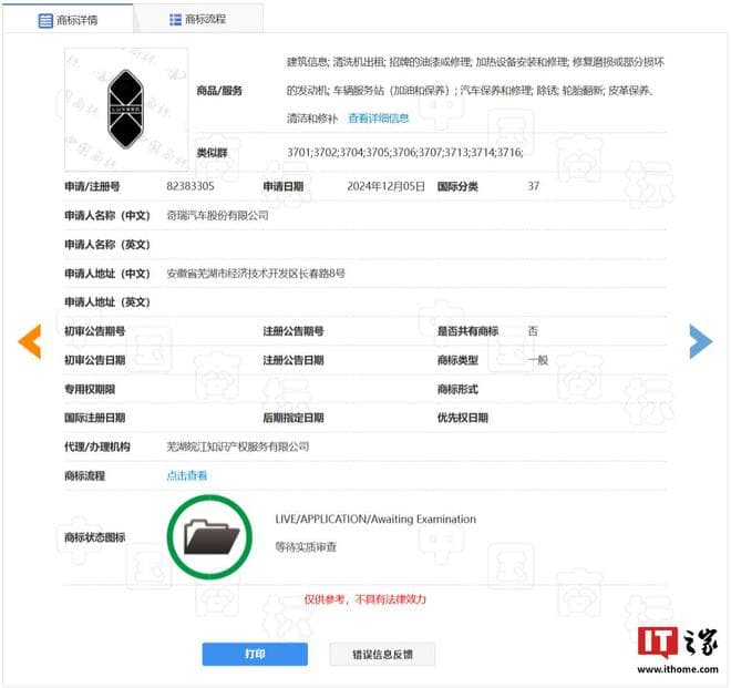 IT之家查询获悉,奇瑞此次申请的智界图形商标目前处于“等待实质审查”阶段,包括国际分类 12 和 37 两类,申请 / 注册号分别为 82387775 和 82383305,涉及的商品 / 服务包括: