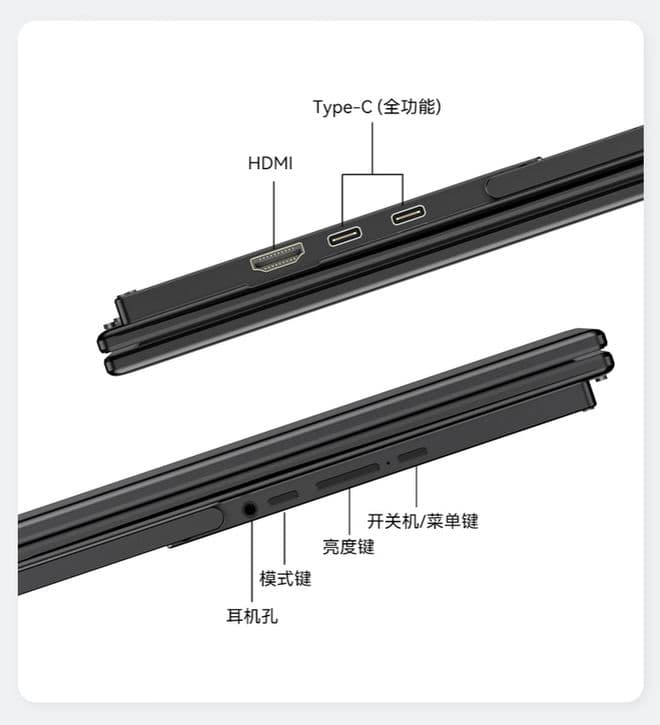 这款便携屏整体重量1.46 千克,形态有点类似微软当年被砍掉的Surface Neo,由两块面板组成,中间用铰链连接,可以最大 315 度旋转,支持帐篷模式和平板模式使用,但不支持触控。