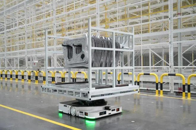 冲压车间采用全伺服生产线,最快 3.75 秒就生产一个 / 一对冲压零件,零件生产完成后由机器人完成 100% 自动装箱,并通过 AGV 将冲压件准确运送到智能立体仓库。 该仓库有 7 层楼高、约 6.5 个篮球场大,通过与生产系统的智能对接,可完成零件自动出库及 AGV 自动配送,实现从冲压线末到焊装车间 100% 自动化无人物流。 智能立体仓库 焊装车间大规模应用高速机器人,实现焊接 100% 自动化,导入 AGV 设备实现运输 100% 自动化,采用视觉引导取件技术实现大中部品 100% 自动取件安装,并应用行业首创的焊接强度 AI 检测,相当于为汽车“拍 CT”,360° 无死角透视车身,确保车身焊点 100% 合格。 涂装车间采用定量机和喷枪系统实现 100% 全车自动涂胶,结合视觉定位系统,打胶精度达到 0.5mm。 总装车间采用高端智造装配工艺,整体自动化率近 30%,导入多项高效自动化项目,如机器人集约阵列无人化全自动分装线、高精度三维视觉定位大物总成自动移载及合装、超小物精细化自动装配等。 焊接车间大规模应用高速机器人