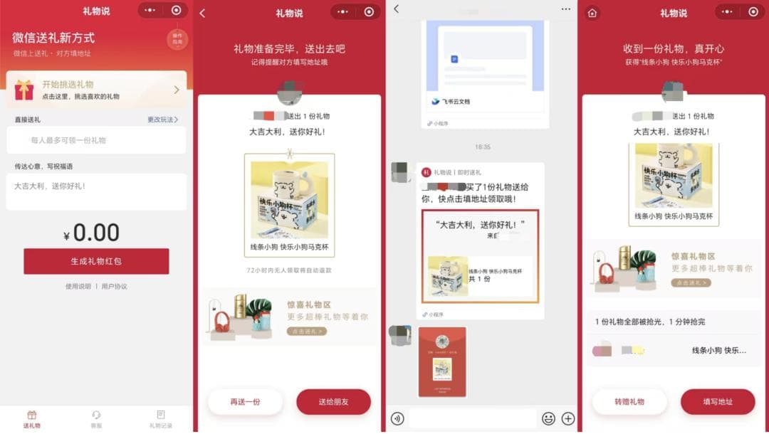 “微信送礼”的送礼路径与“礼物说”小程序几乎完全一致。不同的是,“礼物说”小程序支持用户添加祝福语,玩法也更为多样,参照个人红包、拼手气包等红包玩法,送礼一方还可以选择“定时开奖、满人开奖”等送礼玩法。