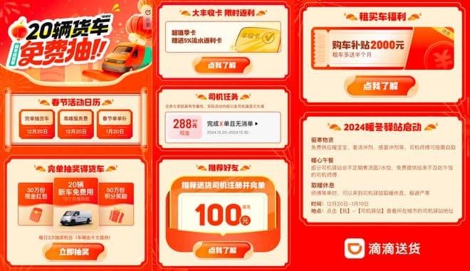 滴滴送货司机生态负责人表示,2025年1月20日平台还将推出“春节服务费”,每单都有司机奖励。“我们会全力服务好司机师傅们,让大家温暖做单,开心赚钱。”