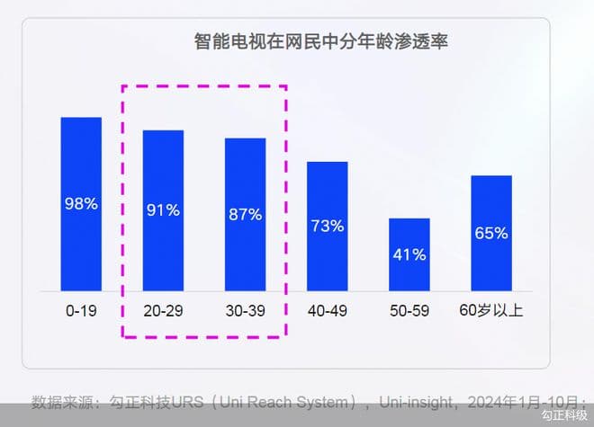 在不同年龄段的人群覆盖上,2024年前10个月,20-29岁人群OTT渗透率达91%,30-39岁人群达87%。OTT在这两个主力消费人群的渗透率都超过85%。