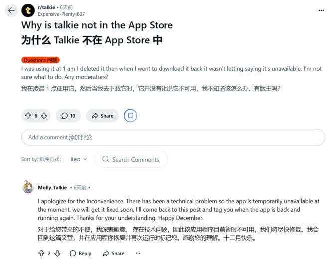 在Talkie被美国市场App Store下架后,Talkie官方人员早期回复网友问询时称"Talkie由于技术原因暂不可下载";