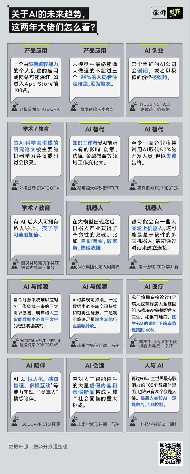 仅仅是时间线的预测,不同专家和机构给出的答案都不太一样。那具体到不同领域的 AI 发展趋势,近两年大佬们又是如何预判的呢?